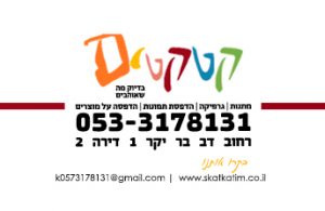 קטקטים- מתנות והדפסה על מוצרים אומנות אסתר סיבוני מבוא דב בר יקר, ירושלים 0773478985 k0573178131@gmail.com http://skatkatim.co.il מבחר מתנות לאירועים מרגשים בהדפסה אישית ובדגש על עיצוב אישי למאורסים, לימי נישואים לטיסה, לגנים לילדים לבתי ספר ועוד הכנסו לאתר ותהנו גם אתם לתת משהו מרגש במיוחד!